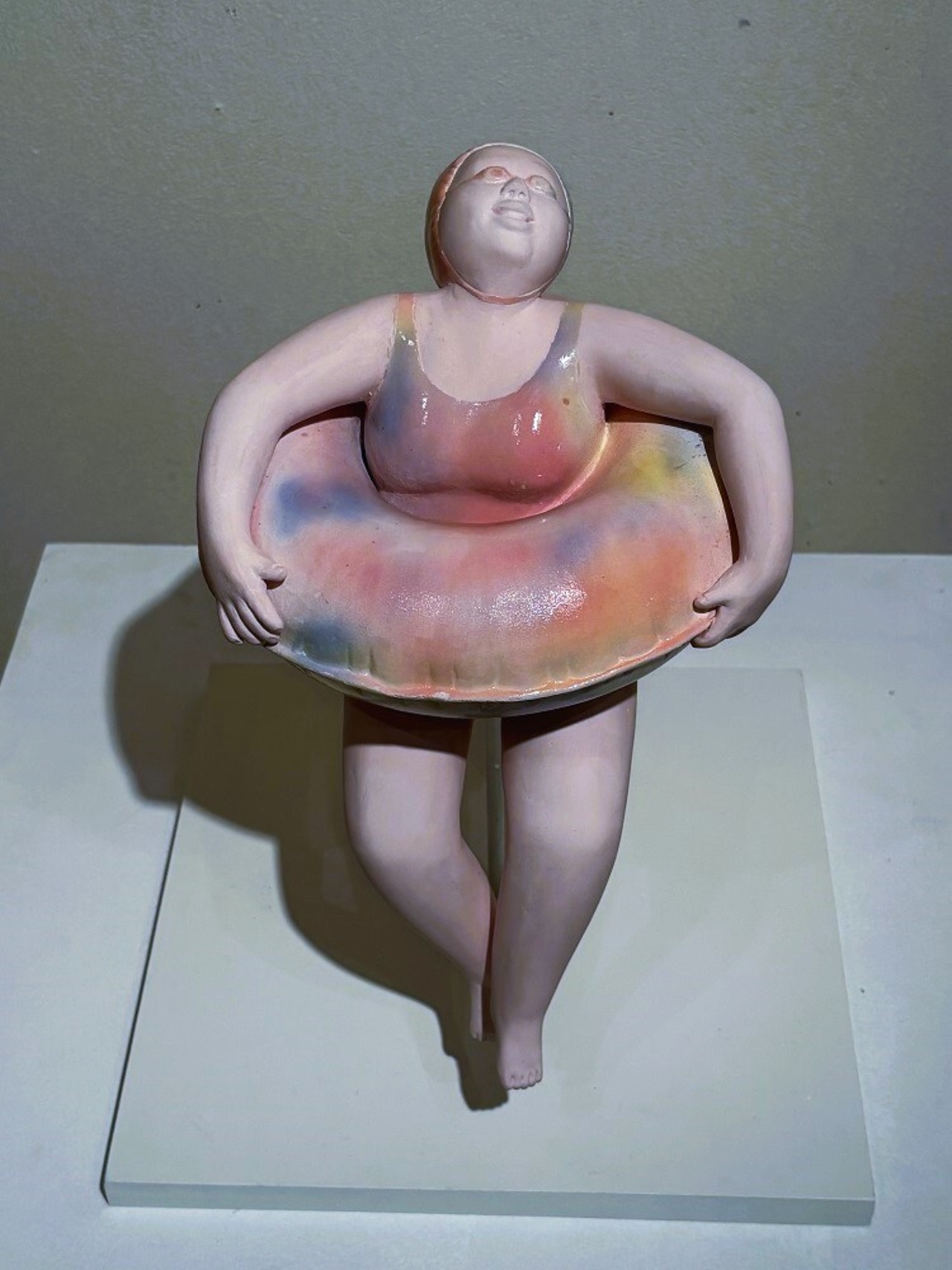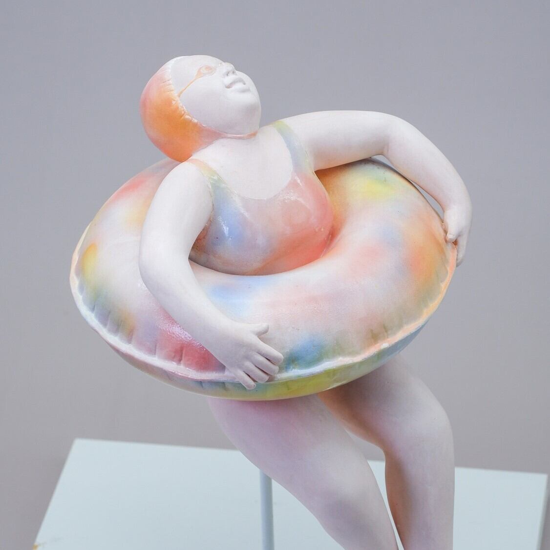 「浮遊中」は、夏の日差しを浴びながら水面でリラックスしているおばちゃんの、開放感あふれる魅力的なアート作品です。磁器と思えないほど柔らかい質感と、浮き輪に包まれるシルエットが他にはないユニークな雰囲気を醸し出しています。見る者に心地よい笑顔をもたらすこの作品は、まるでプカプカと水に浮かんでいるかのような軽やかさを感じさせてくれます。日常の空間に楽しいひとときを添えてくれる特別なアイテムとして、お楽しみいただけます!