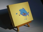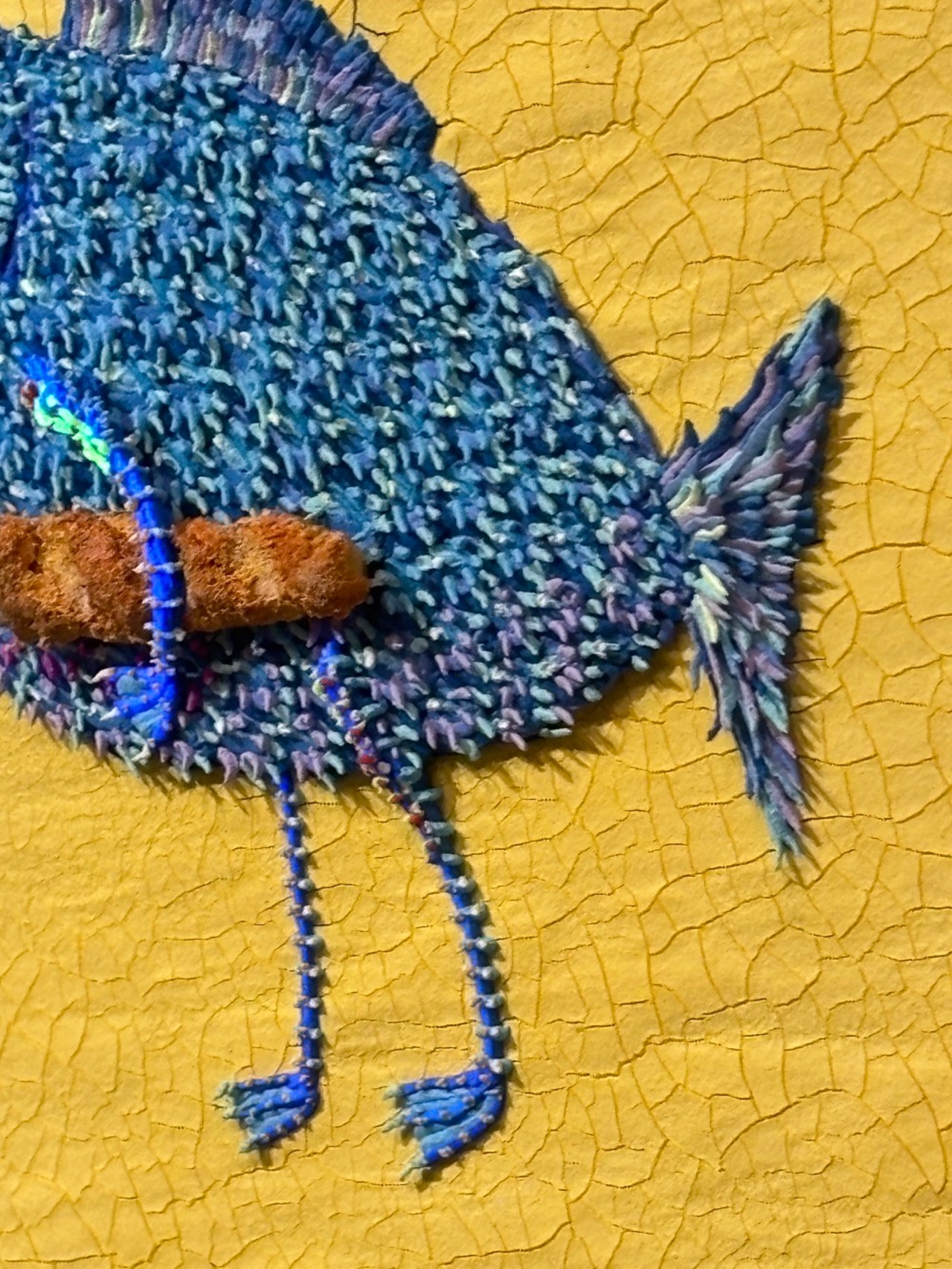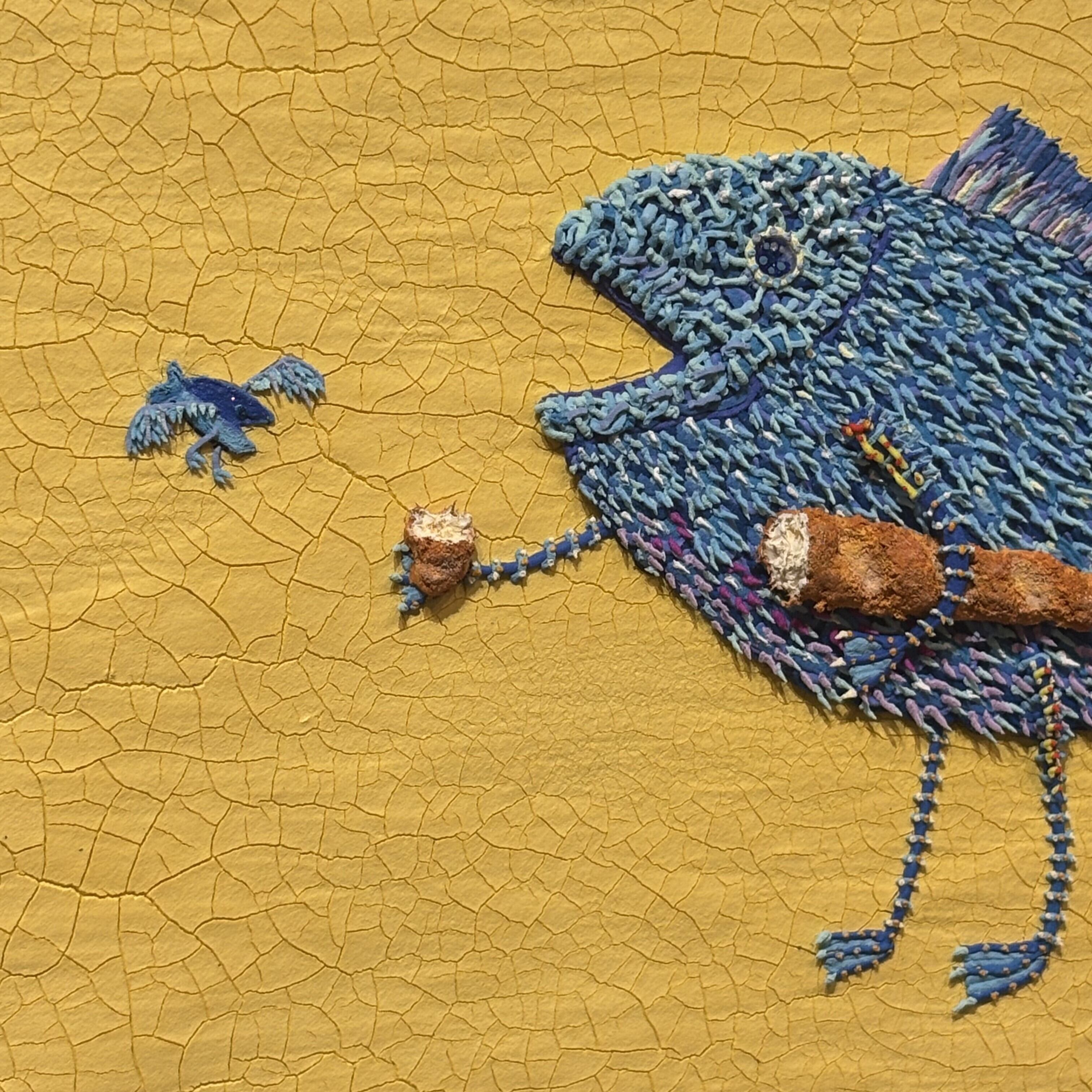 小鳥のように飛ぶ小魚にバゲットをあげる魚。まるで楽しい一コママンガのように見る者を魅了します。アクリル絵具のみを使用した半立体的な描写が、鮮やかなポップな色彩を引き立て、ユニークな視覚体験を提供します。ブラックライトを当てることで、闇の中で奥からも異なる色彩が浮かび上がります。この作品は、日常の空間に遊び心と色彩のアクセントを添える特別なアイテムとしてお楽しみいただけます!