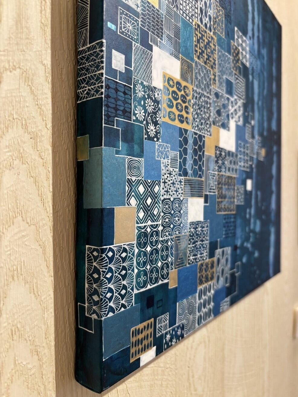 独自の視点で日常の物を模様化し日本的な幾何学模様とのミックスが織りなす美しいアート作品です。フリーハンドで描かれた特徴的なデザインは、見る者ごとに違った表情を持ち、同じ模様は存在しない点が魅力です。また、360度向き変更可能なこの作品は、どの角度から見ても新たな発見がある特別な存在です!