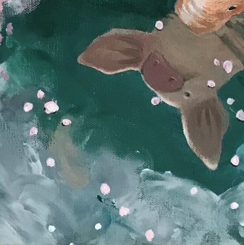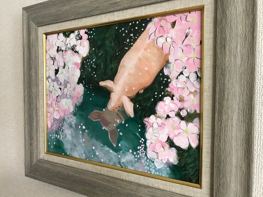 優しい色合いでぶたや花々が描かれたこの作品は、見る人の心に平和と喜びをもたらします。誰かとの特別な出会いや、大切な瞬間を描いた絵画は、空間を豊かに彩ります。